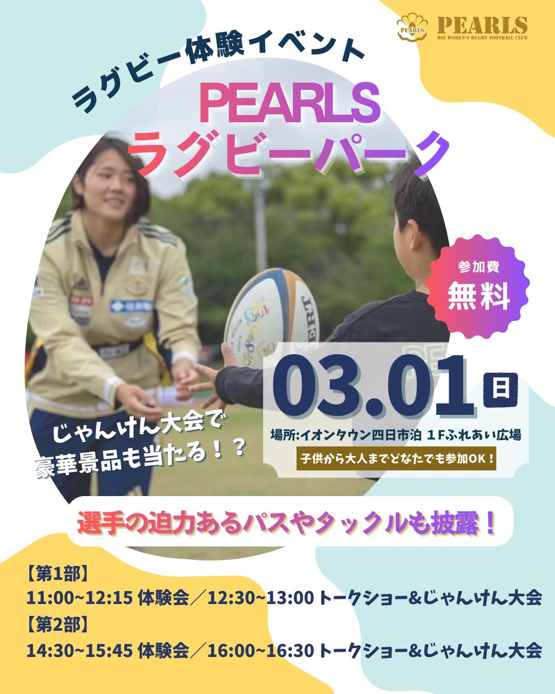 - 3月1日(日)、イオンタウン四日市泊にてPEARLSラグビーパークを開催いたします。