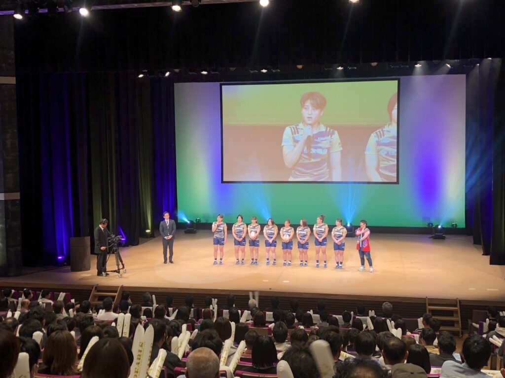 三重トヨタ自動車所属の樋口真央、チームディレクター富川昂、OGで応援団長の山本さやかを中心に、試合時に行っている応援の実演や、ボールパス、ラインアウトを披露いたしました。