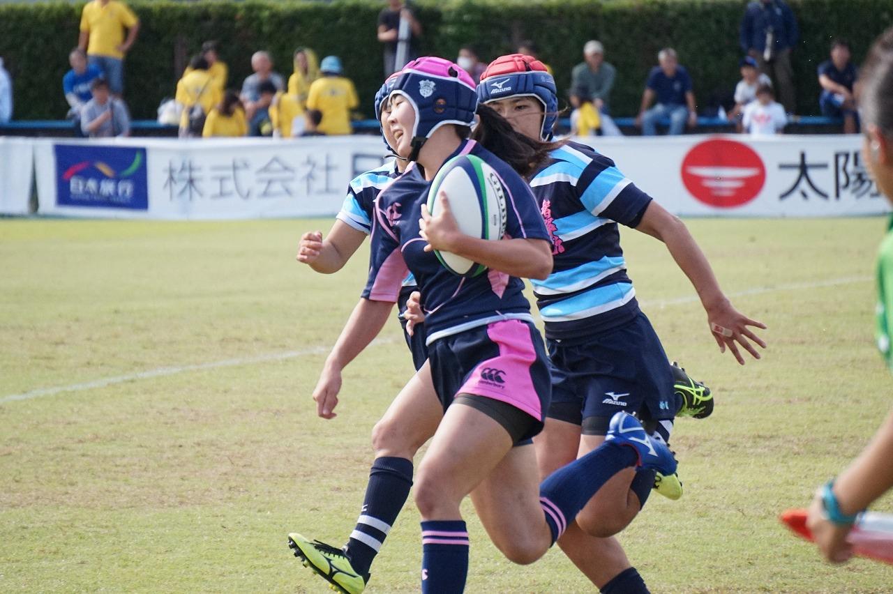 1日目の予選プールでは初戦に前回優勝校の石見智翠館高校(島根県)と対戦。昨年度から無失点を続けていた絶対王者に対し加藤まい(四日市農芸高校2年)がトライを奪い前半は肉薄するも、後半に引き離され7-40(前半7-14)で初戦を落としました。2試合目は開志国際高校(新潟県)と対戦。外国人留学生を擁する相手に対してスピードで圧倒し、43-5(前半12-5)で勝利を収めました。