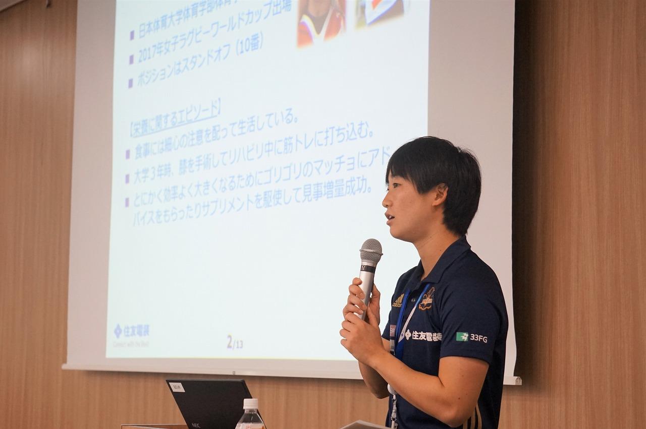 セミナーではチームの紹介から始まり、①山本実選手がアスリートとして普段から取り組んでいる食生活を話しながら、やせる秘訣を紹介。②庵奥里愛選手を中心に、体のバランスを整える自重トレーニングを実践。③伊藤絵美マネージャー指導の下、ラグビーボールを使ったレクリエーション、そしてPEARLS選手によるプレー紹介もさせていただきました。