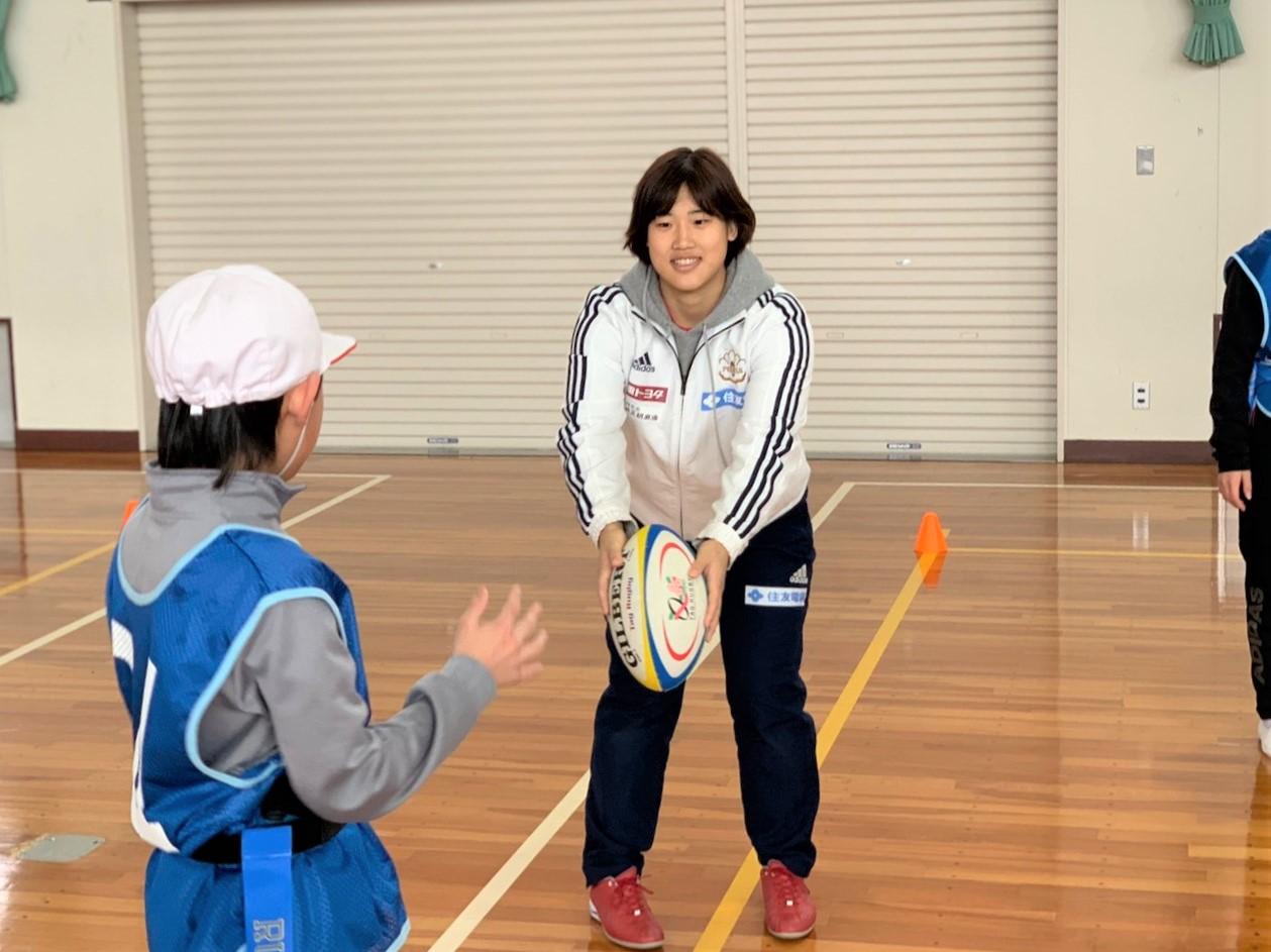 鵜川原小学校では2学期の授業でタグラグビーをしたということだったので、今回はゲームを中心に指導させていただきました。生徒の皆さんは積極的に声を出してボールを繋ぎ、元気いっぱいに走ってくれて、PEARLSのメンバーも一緒に笑顔で楽しませていただきました。今回の授業を受けていただいた生徒たちの中から、ラグビーに興味を持って始めてくれる子供たちが出てくれたら幸いです。
