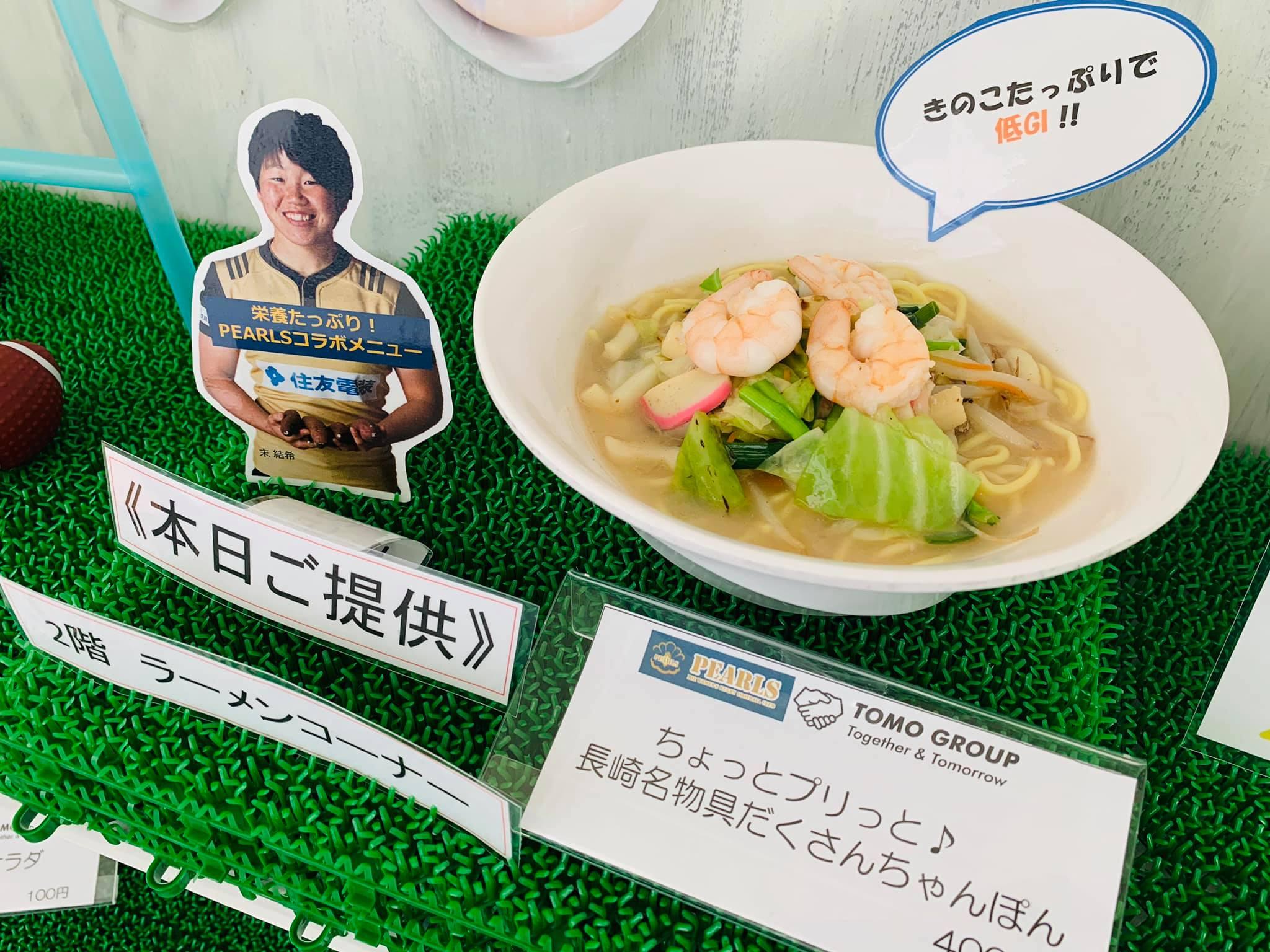 各選手の出身地にちなんだご当地メニューも献立に組まれてており、初日は末選手の出身地にちなんで「ちょっとプリっと♪長崎名物具だくさんちゃんぽん」が提供されました。