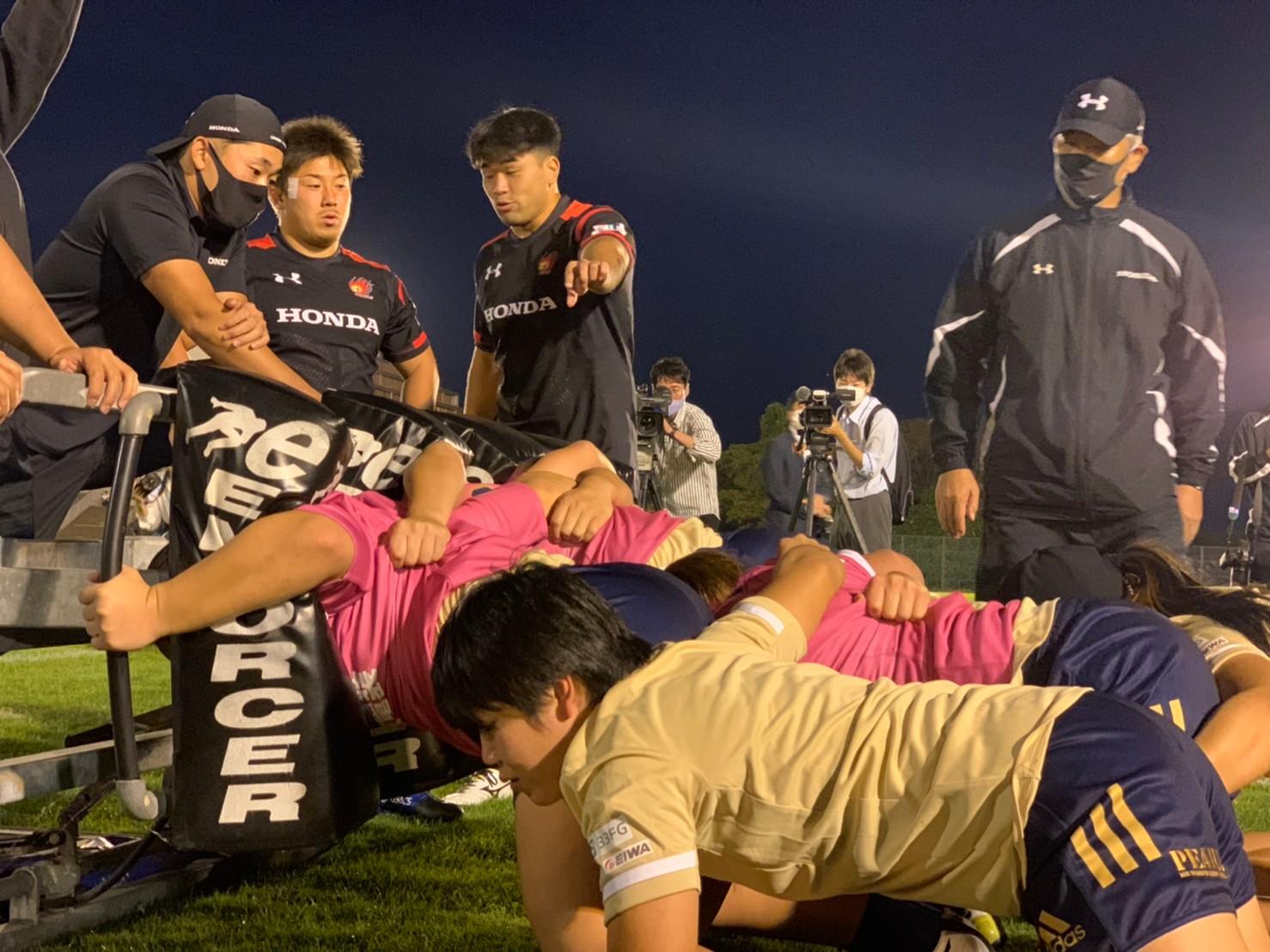 フィールドセッションでは、Honda HEATの豪華コーチ陣・選手の皆さんからラン&パス、タックル、スクラム等のスキルを学び、予定時間をオーバーするほど熱いご指導をいただきました。多くの報道陣にも囲まれながら、PEARLSの選手たちは溌溂とした表情でトップレベルのコーチングを受けました。