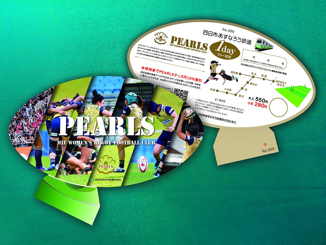 ラグビーボール形をしたこの切符は、あすなろう四日市駅にて11月1日(日)午前10時より発売開始となり、限定555枚の販売となります。取扱期間は令和2年11月1日~令和3年10月31日までの1年間、乗車日当日に限り有効となります。この1dayチケットをご購入いただいた方の特典として、期間中PEARLSの試合やイベント会場にてPEARLS応援グッズをご購入の際、購入代金から10%割引をさせていただきます。ただし、インターネット販売は適用外となります。またイベントによっては物販を実施しない場合もございますのでご了承ください。