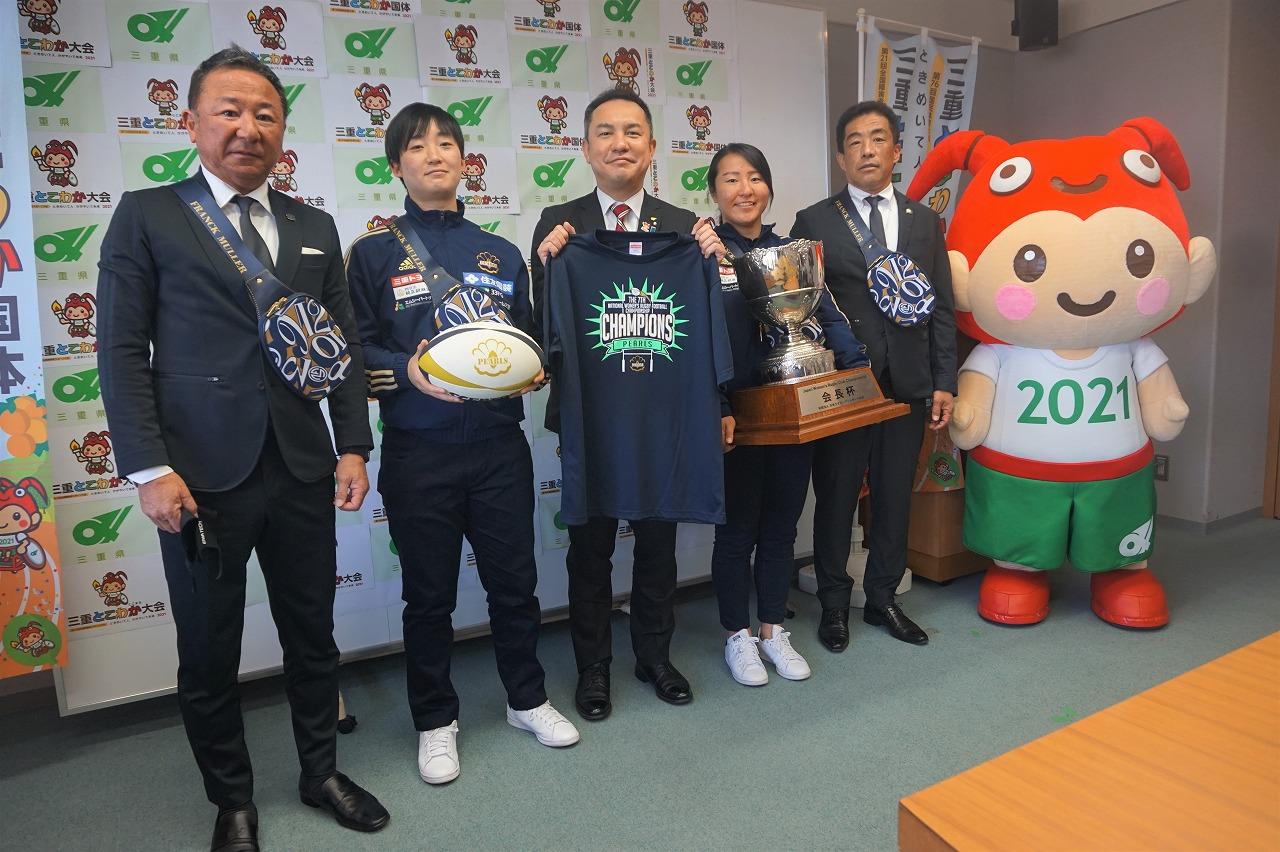 「コロナ禍で活動もままならない中、あらゆるスポーツ競技で大会等が中止となり、多くの苦労を乗り越え今シーズン唯一の大会で優勝し、よくぞ日本一になってくれました」と知事から祝辞をいただき、その要因を問われると、齊藤キャプテンからは「こういう時だからこそ、お互いが励まし合いONE TEAMになって心を一つにできたから日本一になれた」と語りました。最後には今年開催される『三重とこわか国体』での優勝はもちろん、『太陽生命ウィメンズセブンズシリーズ』と『日本選手権』でも優勝し、三大タイトルの獲得を誓いました。