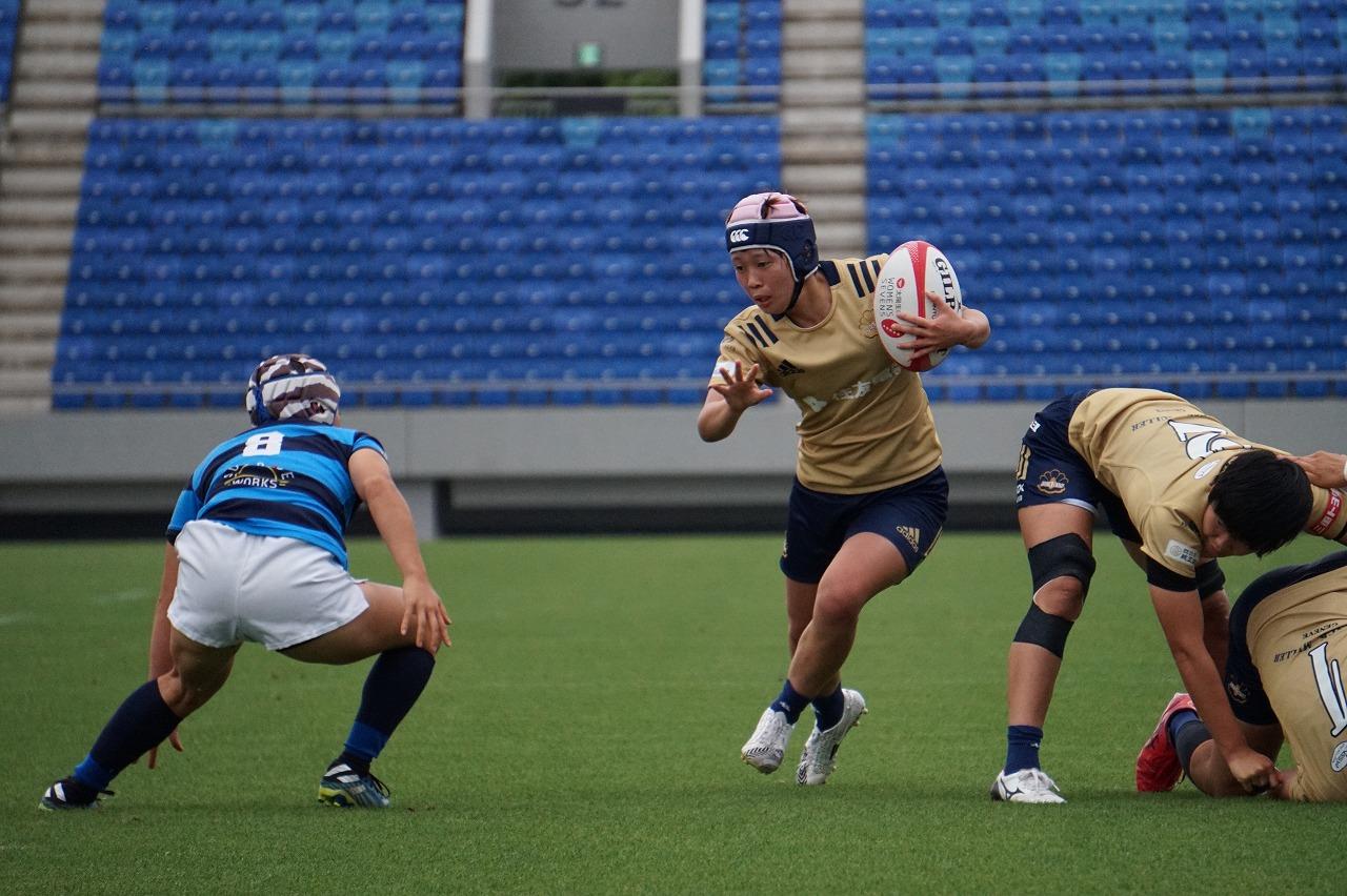 北海道バーバリアンズディアナが出場辞退のため、1試合目は不戦勝となり第2クールからの登場となったPEARLS。初戦は日本体育大学ラグビー部女子と対戦し、前半保井沙予(主体会病院)と末結希(住友電装)がトライを挙げ12-0で折り返すも、キックオフ直後のプレーで齊藤聖奈(住友電装)が負傷退場し、前半途中でティマイマ・ラヴィサも怪我で離脱。暗雲立ち込める中後半に入ると、立て続けにトライを奪われ点差を詰められましたが、山本実(住友電装)のトライで何とか振り切り、19-15(前半12-0)で接戦をものにしました。