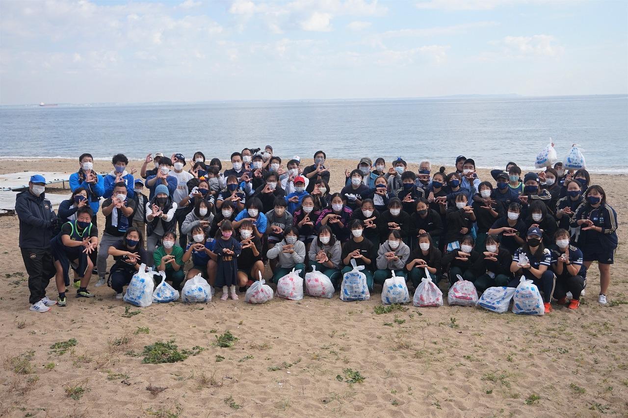 PEARLSのトップ選手・スタッフ、ジュニアチームの選手やスクール生の子供たち、パートナー企業の住友電装、コスモ石油、パソナの皆様をはじめ85名のPEARLSファミリーの皆様にご参加いただき、1時間砂浜を歩き回り、不燃ごみ・可燃ごみを含め約90袋のごみを集めていただきました。土曜日でお休みのところご参加いただいた皆様には心より感謝申し上げます。