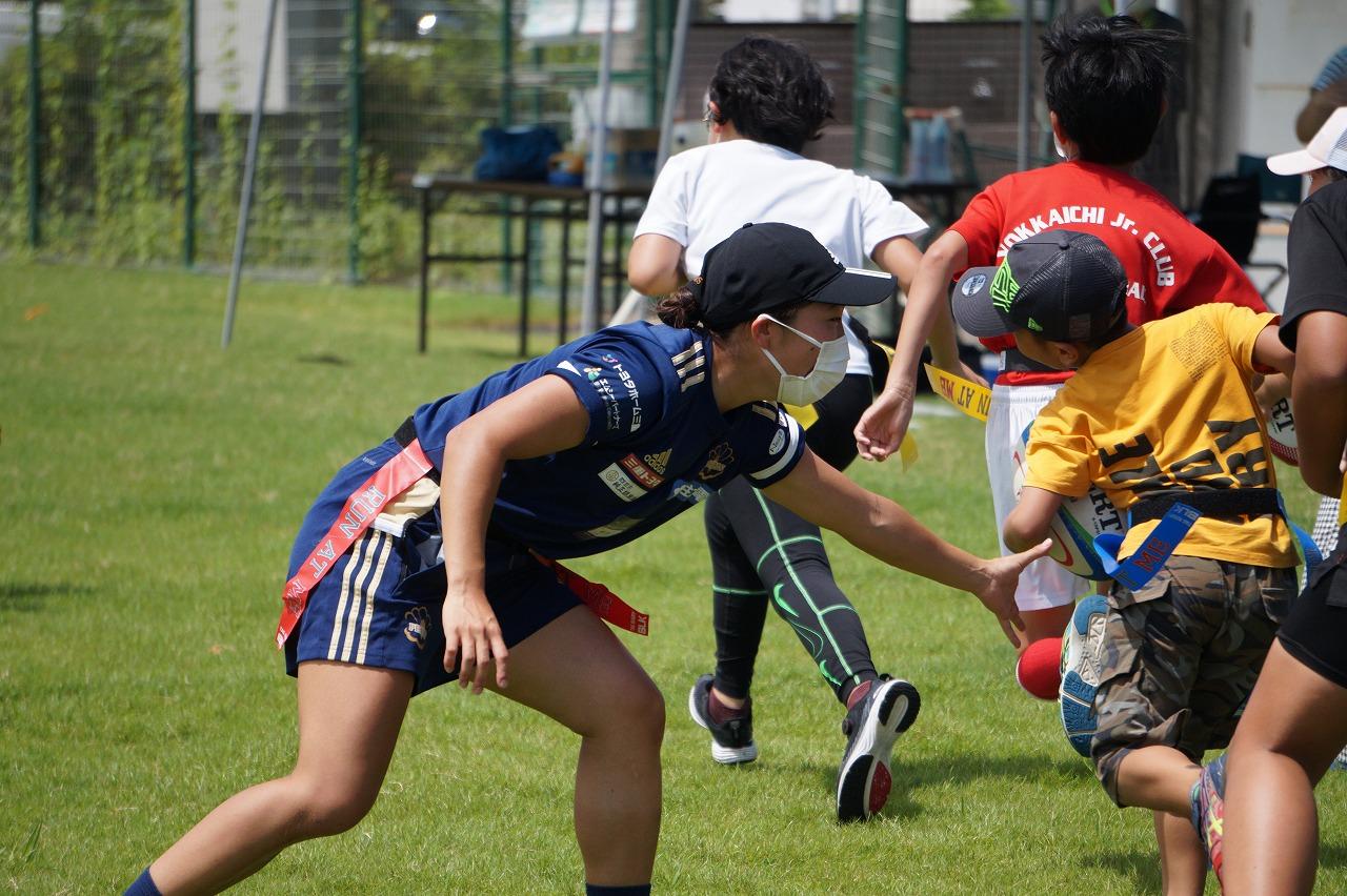 ゲームの後には、PEARLSの選手たちによる激しいタックルのデモンストレーションで盛り上がり、子どもたちもタックルやキックに挑戦し、盛りだくさんの内容で体験教室を終えました。暑い中元気いっぱいに参加してくれた皆さんには心より感謝申し上げます。PEARLSの選手・スタッフも皆さんから元気をいただき、とても楽しい時間を共有させていただきました。
