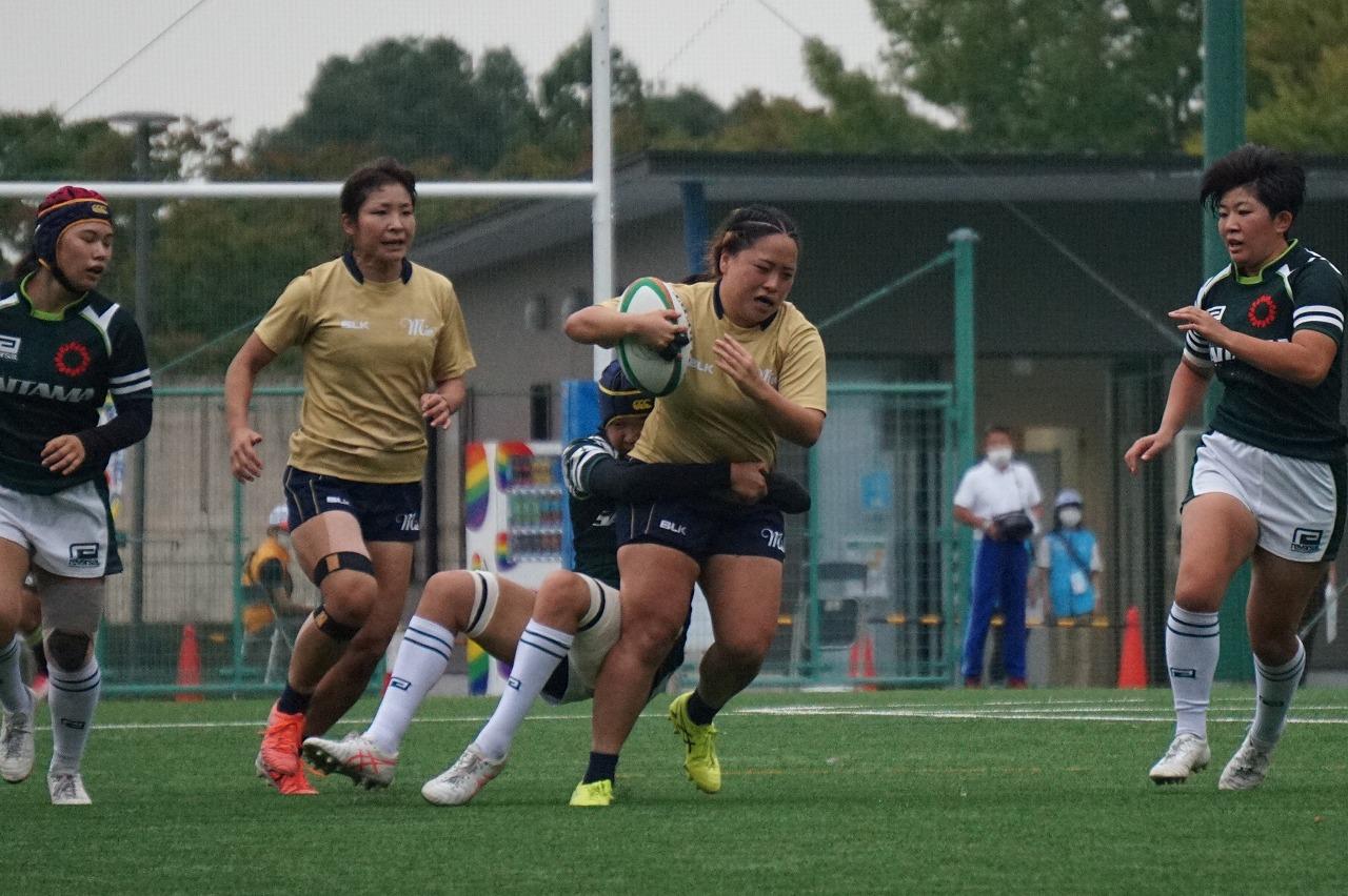 3年ぶりの開催となる国民体育大会の初戦は、過去4大会全てで3位以内に入っている埼玉県代表と対戦。緊張感のある立ち上がりは相手ボールを維持され、我慢のディフェンスの時間帯が続きましたが、自陣ゴール前でボールを奪い返すと、保井沙予選手(主体会病院)が80mを走り切り先制トライを挙げました。後半開始直後に同点に追いつかれますが、慌てることなく再び保井選手がトライを返し、後半6分に片嶋佑果選手(日商)がダメ押しトライを奪い、17-5(前半5-0)で勝利を収めました。