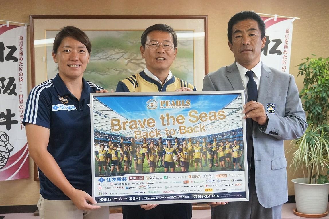 7月24日(火)PEARLS(パールズ)の齋藤GMと松阪市出身の玉井選手(エイワテック)が、竹上松阪市長に表敬訪問をさせていただきました。