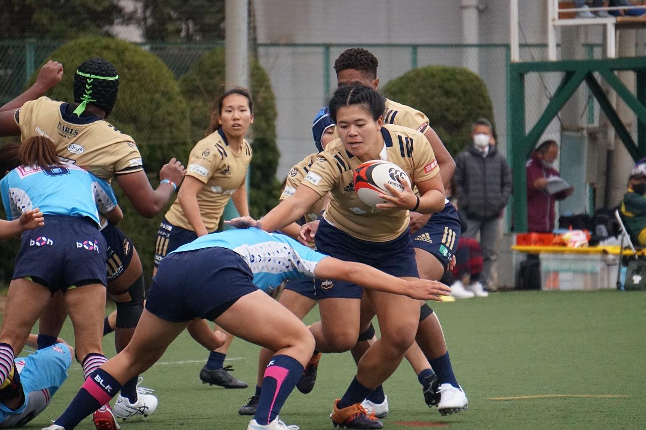 前半は相手の出足の良いディフェンスに思うようなアタックが出来ませんでしたが、古屋みず希選手(住友電装)のトライを皮切りに、徐々にペースをつかみ始めました。後半に入ると足が止まってきた相手に対し、フォワード&バックス一体となった攻撃でトライを重ね、大差で2連勝を飾りました。