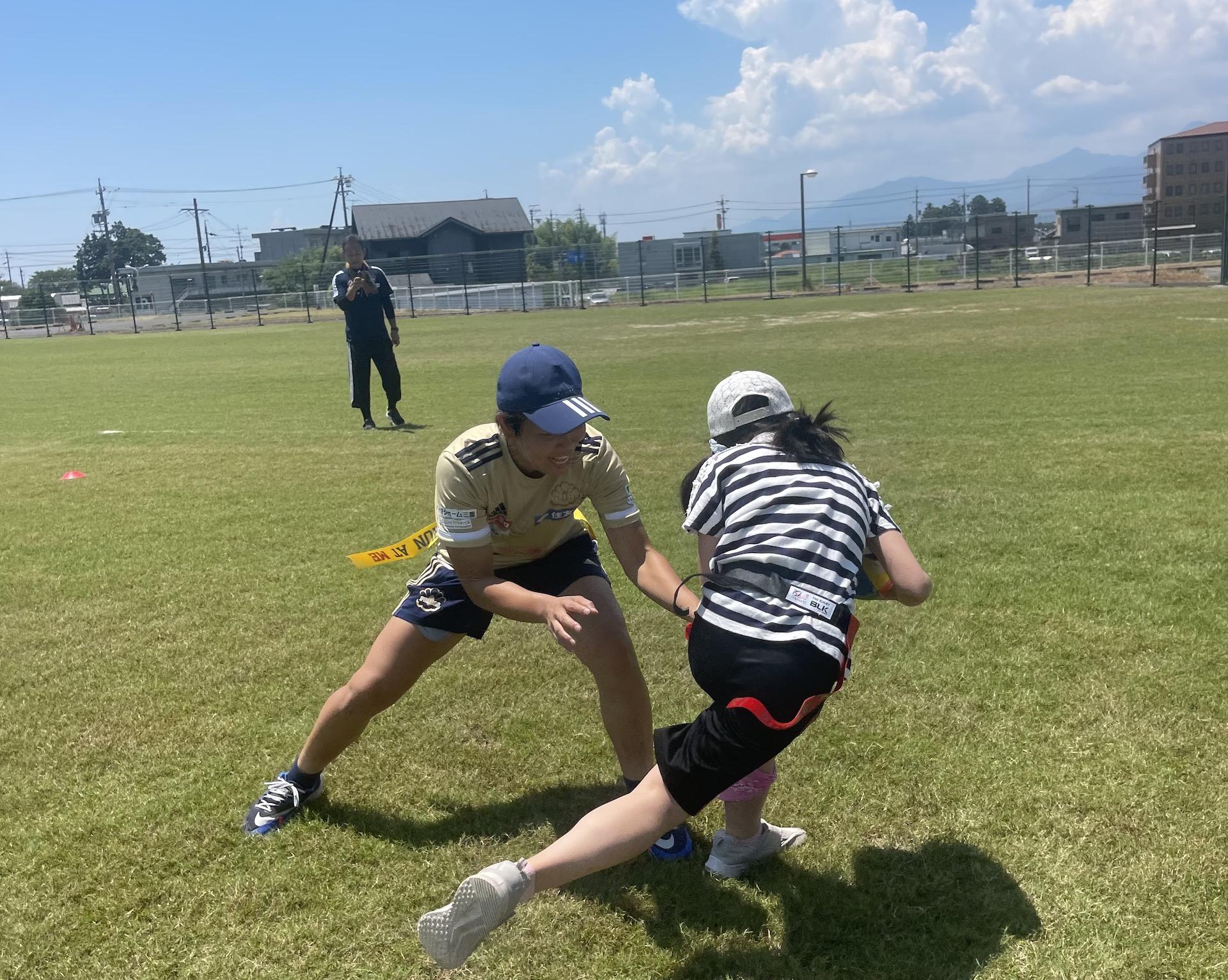 最後にタグラグビーを実施し、「子どもチーム」対「PEARLS」で対戦し上手にパス回しをしたり、選手の隙間を走り抜けたりとどんどん吸収していく「子どもチーム」の勝利で体験教室を終えました。