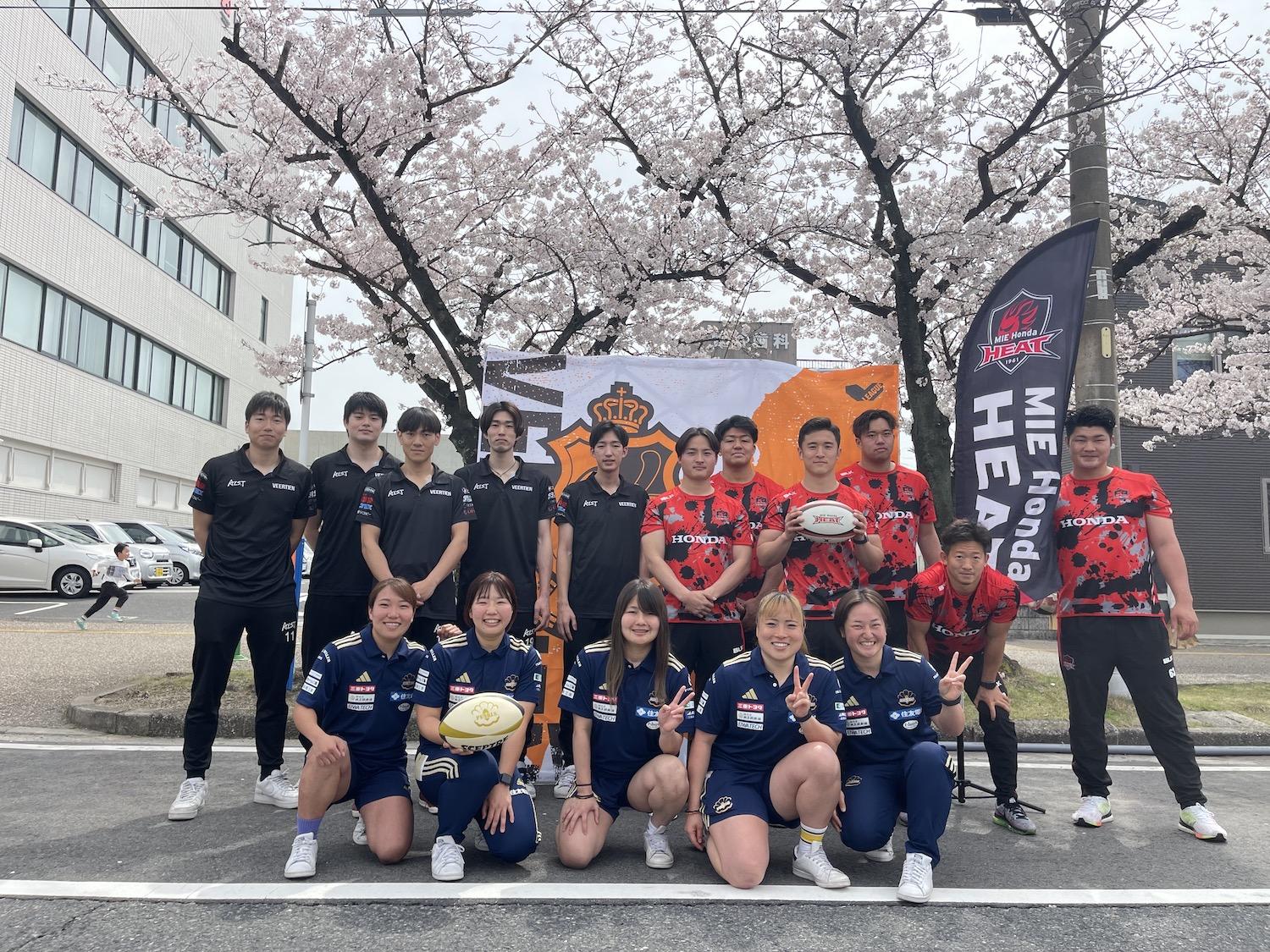 桜満開の三滝通りにて、初の試みとなる3チームでデモンストレーションを行なったり、冷麦キャッチ、選手との写真撮影、バレーボール体験やラグビーボールでのストラックアウトを体験していただき、会場を盛り上げました。