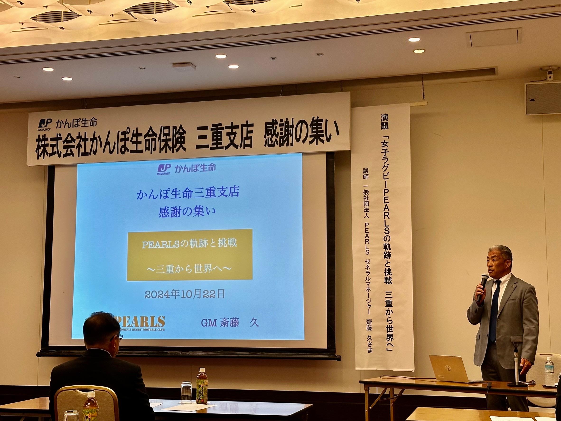 第一部では、PEARLSのゼネラルマネージャーである齋藤久が「女子ラグビーPEARLSの軌跡と挑戦 三重から世界へ」をテーマに講演を行い、皆様に女子ラグビーの歩みや今後の挑戦についてお話させていただきました。