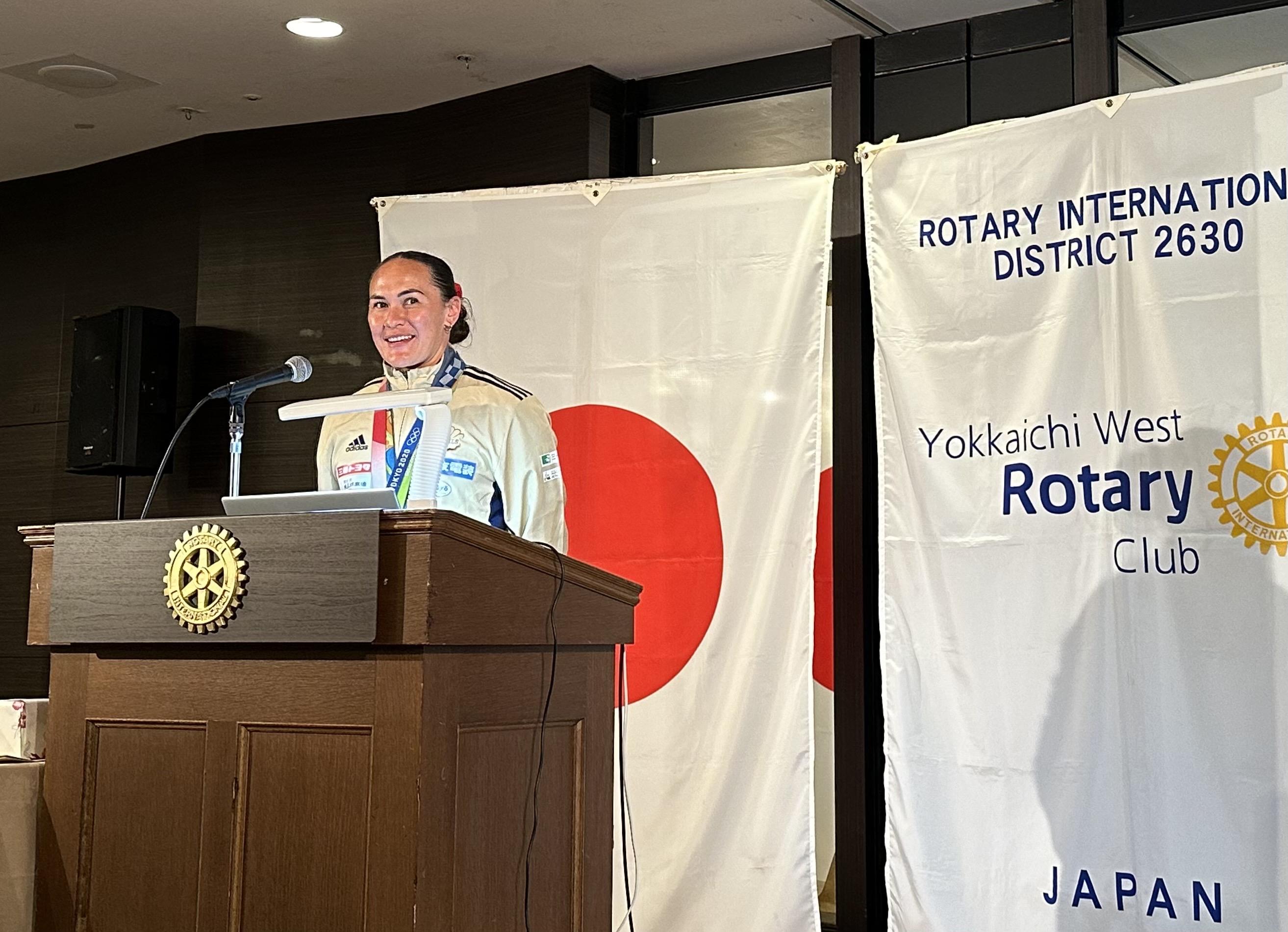 12月6日(金)、四日市西ロータリークラブの定例会にて、PEARLS 代表理事 中岡昭彦が「三重から世界へ」をテーマに登壇し、今シーズン新加入選手で、オリンピックメダリストのPortia Woodman-Wickliffe (ポーシャ・ウッドマン ウィクリフ)選手をご紹介させていただきました。また、ポーシャ選手もスピーチをさせていただき、定例会後にはご参加の皆様と交流をさせていただきました。