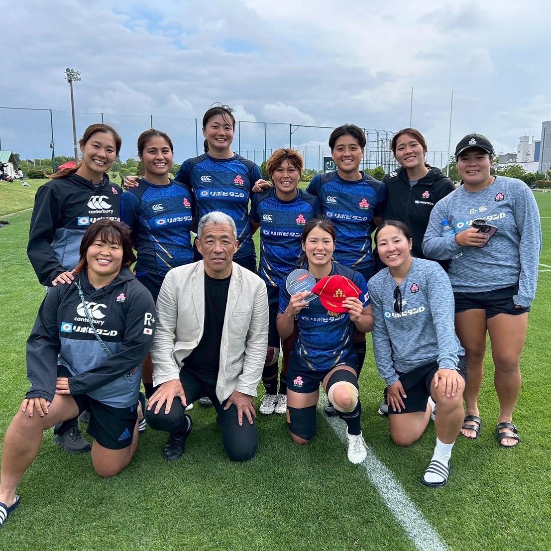 写真は、齋藤久GMと合宿参加の古屋みず希選手、甲斐早智子選手、さらに、女子15人制強化合宿に参加中の北野和子選手、永田虹歩選手、齊藤聖奈選手で撮影しました。