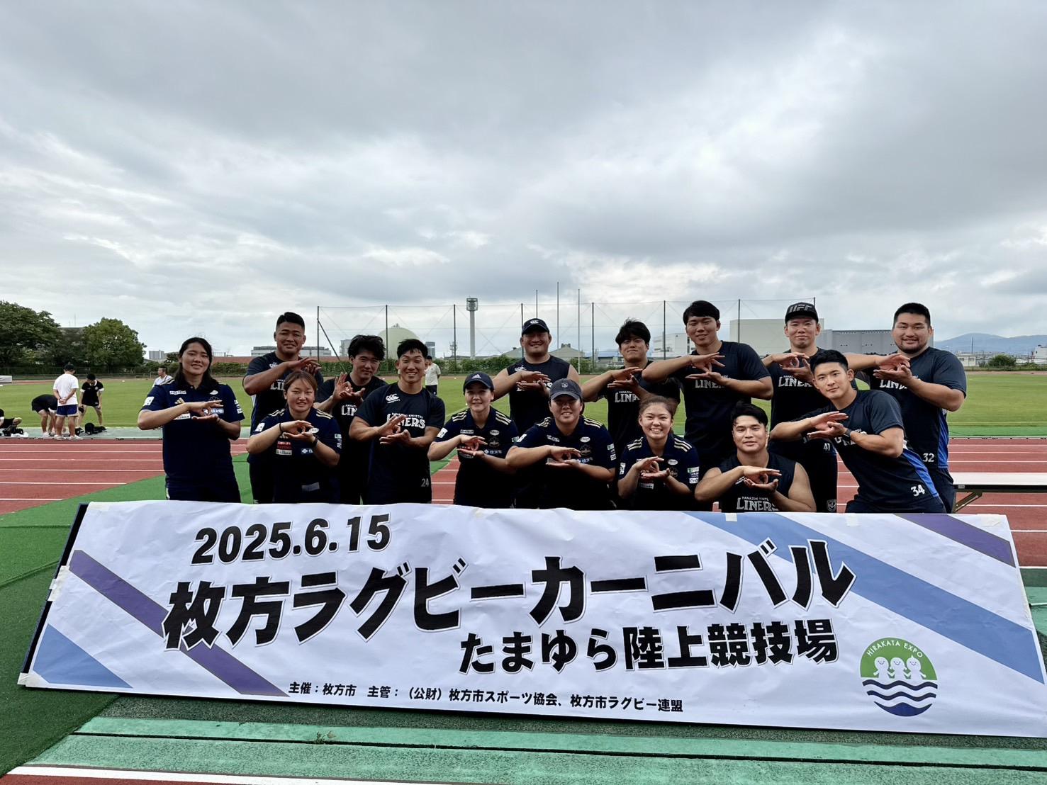 6月15日(日)、たまゆら陸上競技場にて開催された「枚方ラグビーカーニバル」にご招待いただき、花園近鉄ライナーズの皆様と共にラグビー体験会を実施いたしました。
