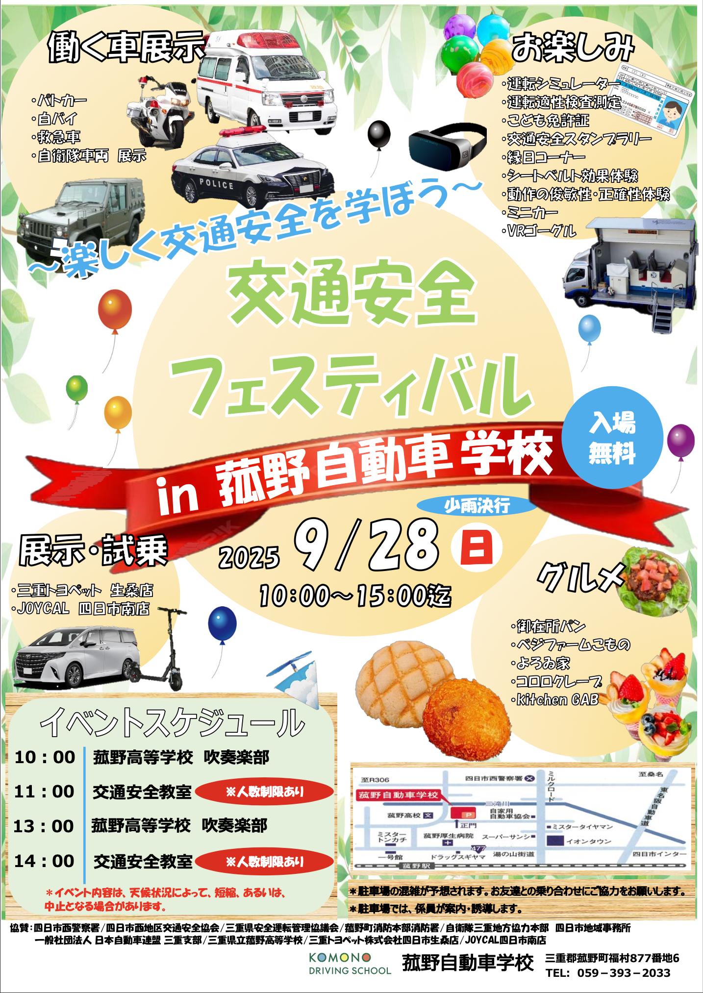 9月28日(日)に開催される「〜楽しく交通安全を学ぼう〜交通安全フェスティバル in 菰野自動車学校」に参加いたします。