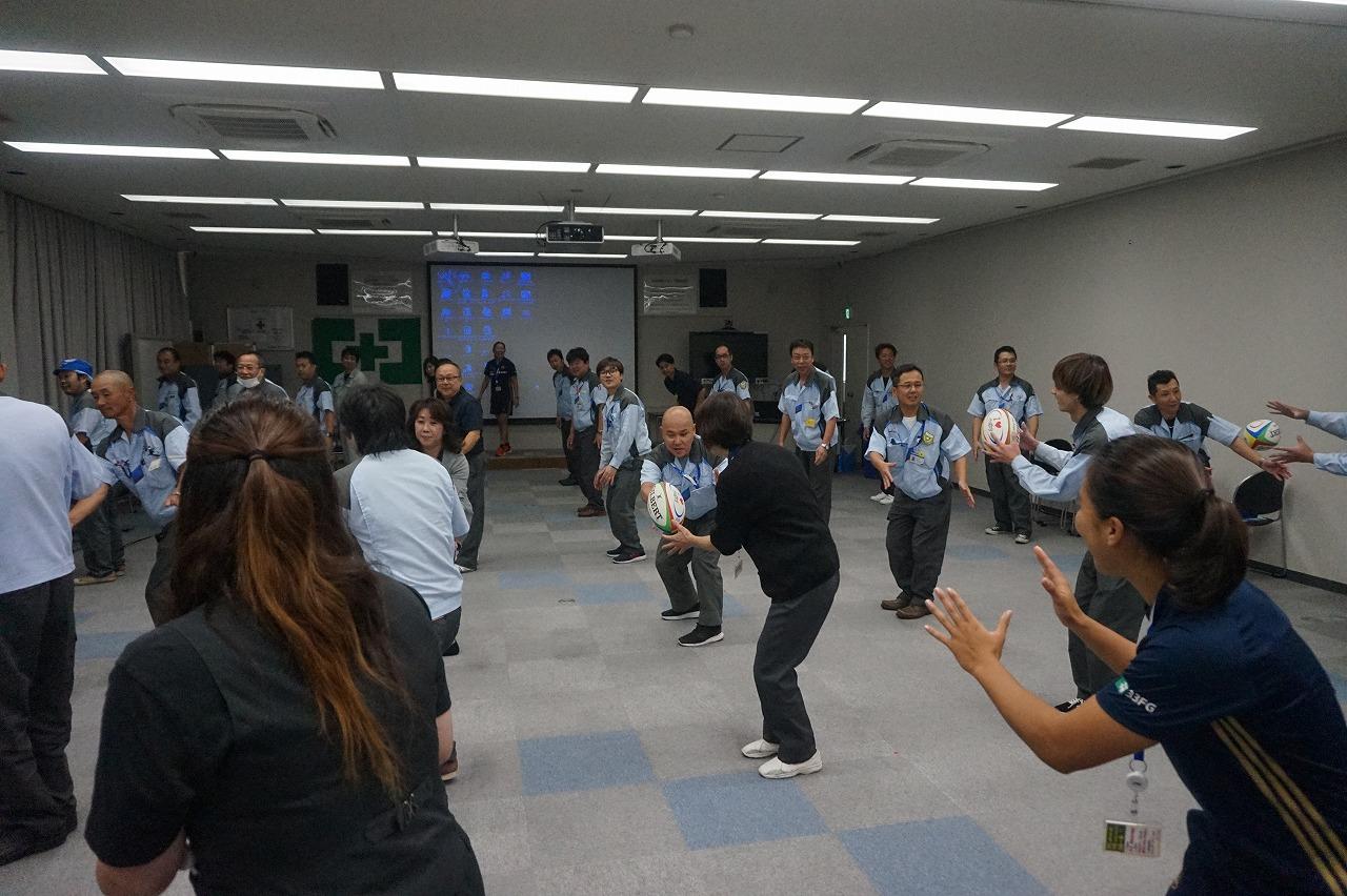 90分間のセミナーではチームの紹介から始まり、栄養講座、体のバランスを整える自重トレーニング、最後にはラグビーボールを使ったレクリエーションを実施。参加者の皆様はラグビーボールを始めて触ったという方がほとんどでしたが、徐々に声を出してパスを受けたり、ゲームでも最高の笑顔で盛り上がりました。あっという間の時間でしたが、参加者の皆様には心地良い汗をかいていただき、社員間のチームワーク醸成にも繋げることができたかと思います。